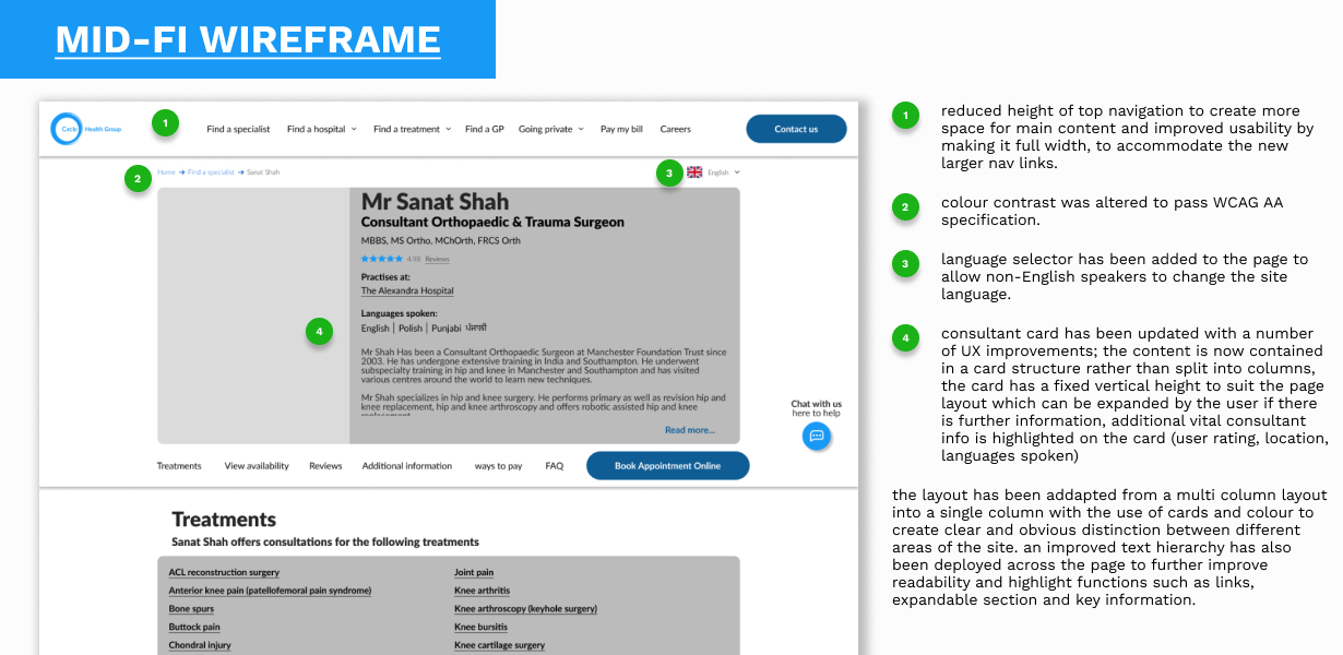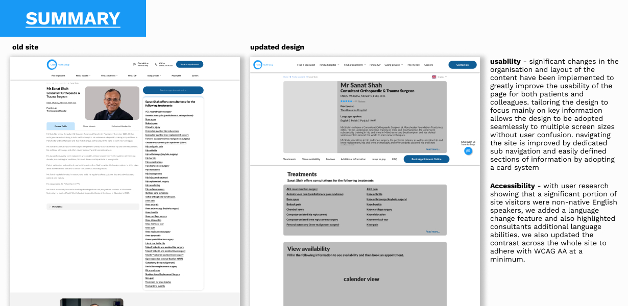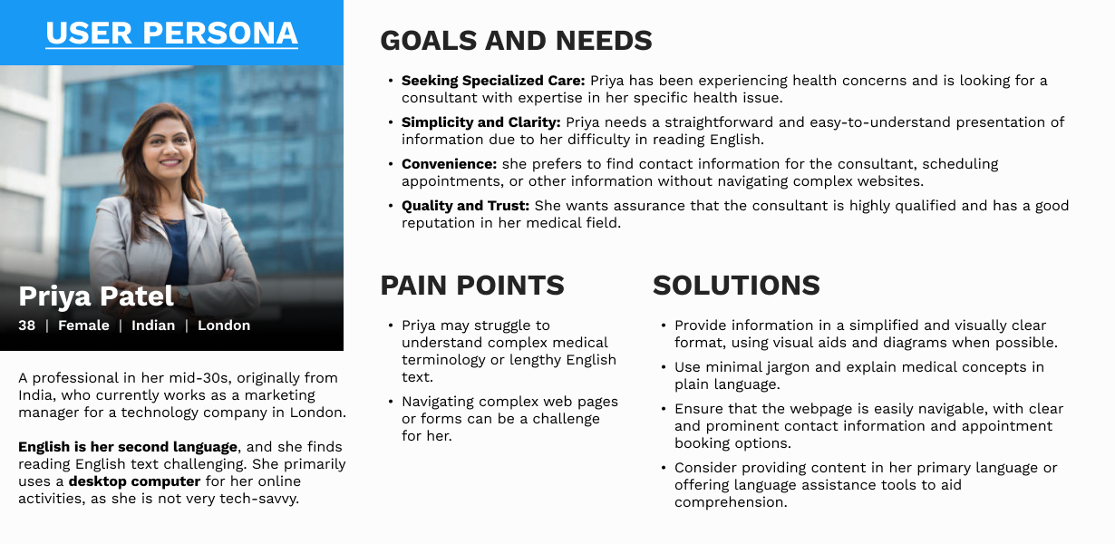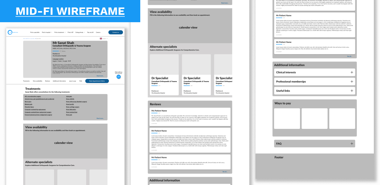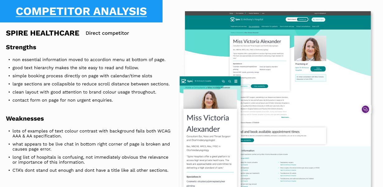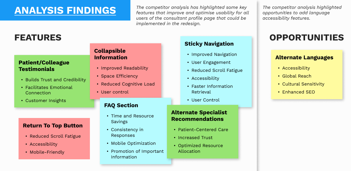 My role involved redesigning a hospital's consultant profile page to make it more accessible and user-friendly for a diverse audience, including patients, colleagues and returning users. The brief was a challenging one, focusing on overcoming language barriers, simplifying complex medical jargon, and creating a design that was both clear and tech-friendly for users with varying digital literacy. The process began with extensive user research and competitor analysis to foster empathy and identify key user needs.