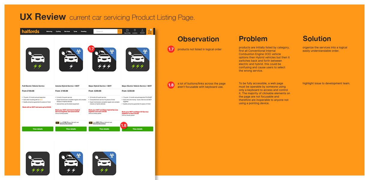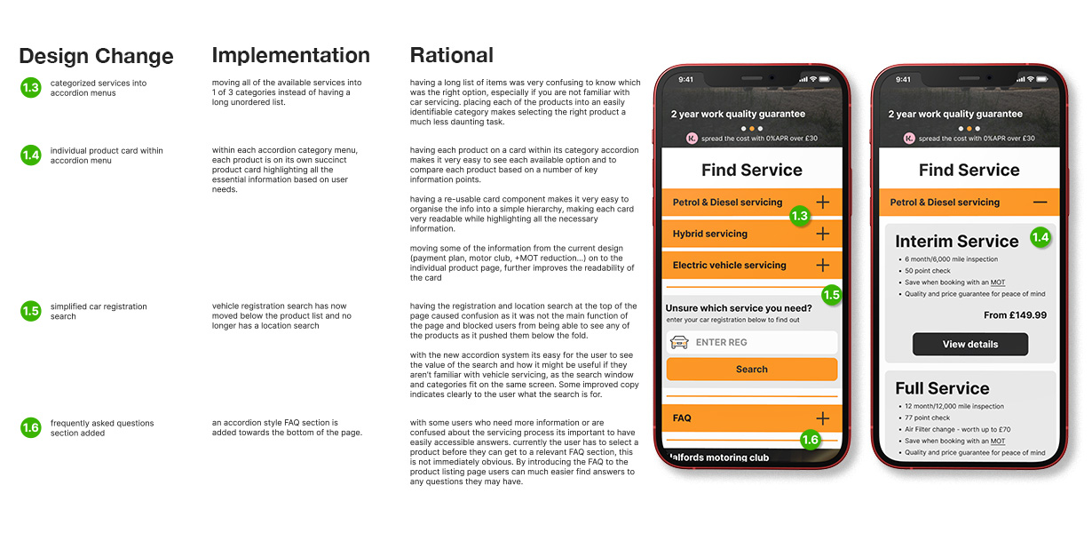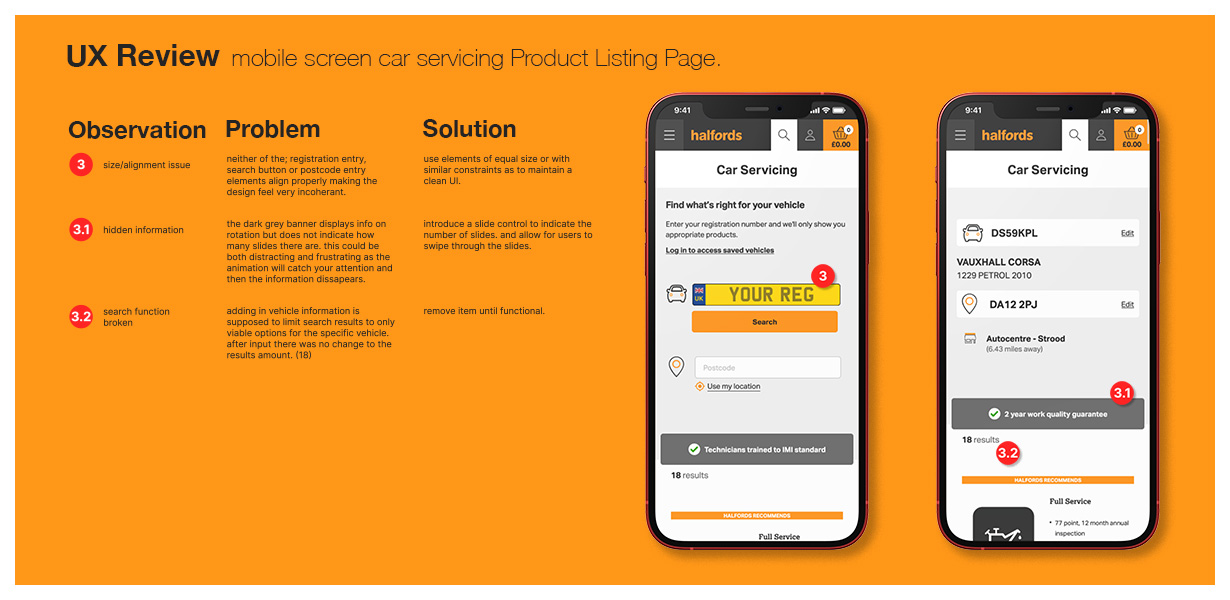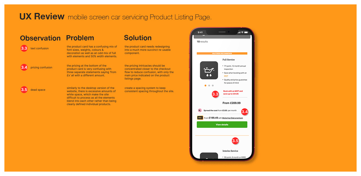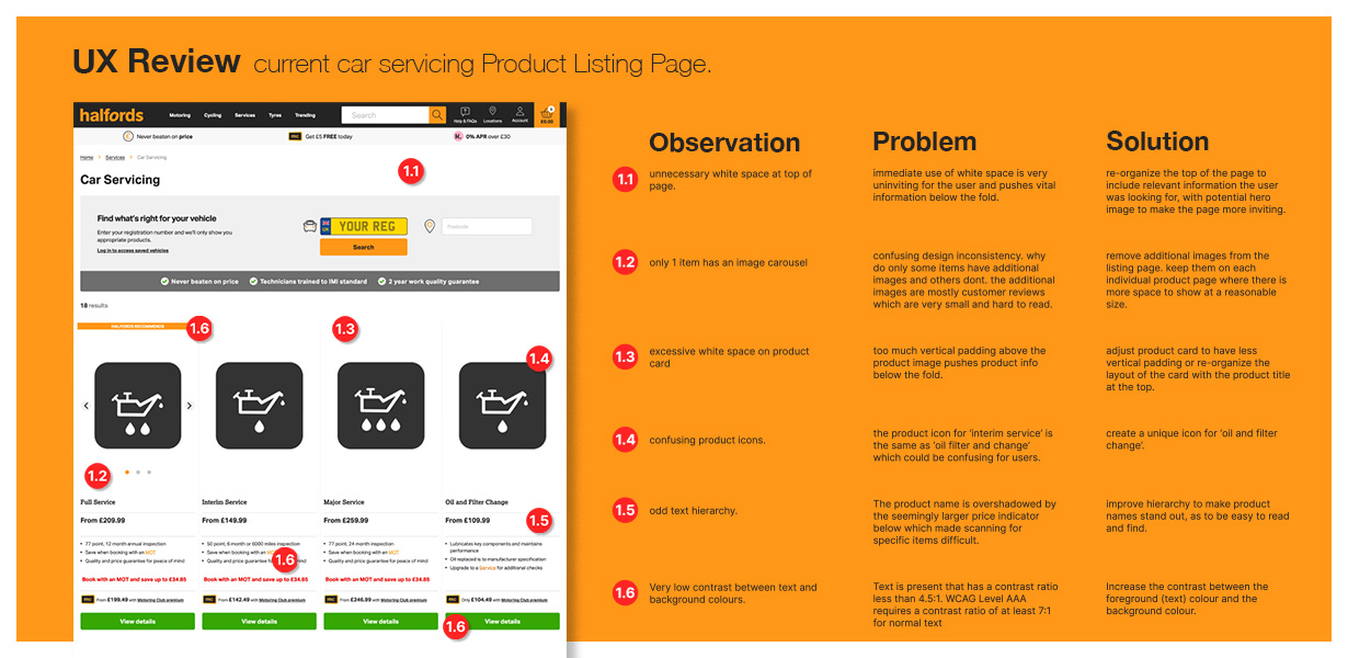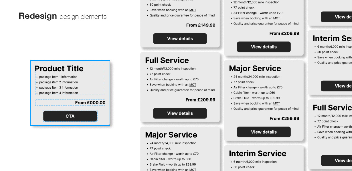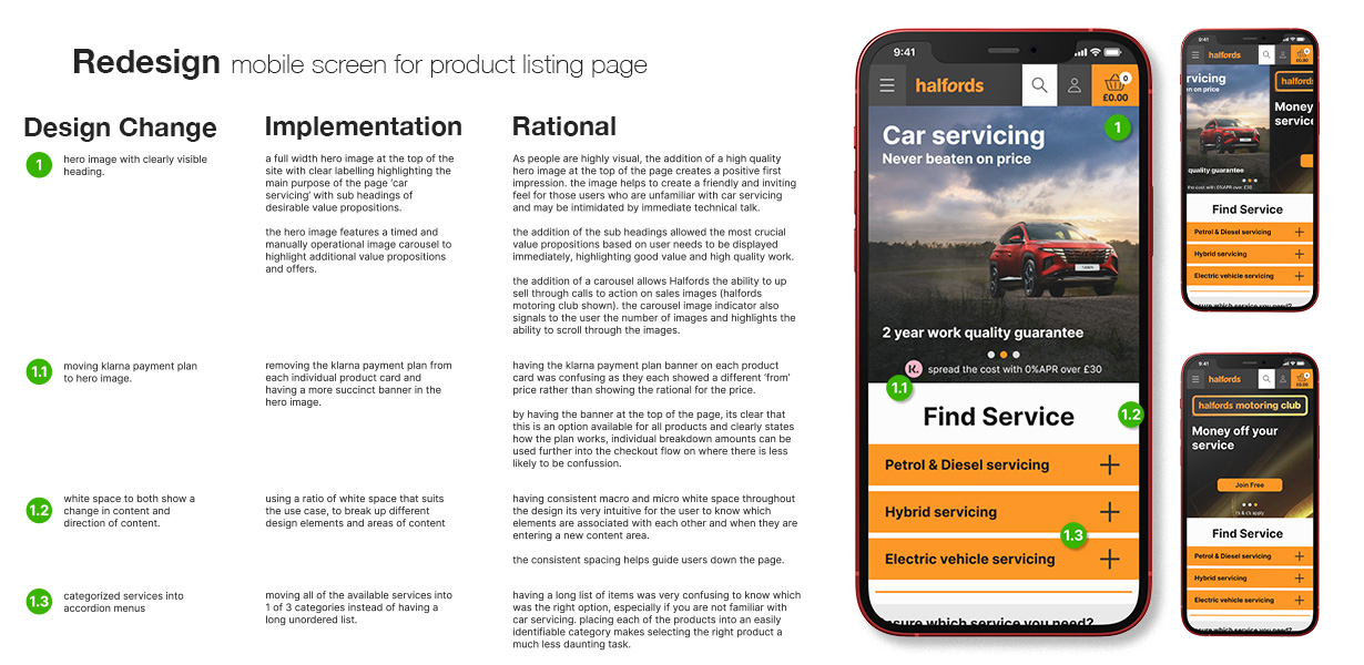This project involved a UX review and redesign of a car servicing Product Listing Page, with a focus on improving the mobile experience. The core challenge was to enhance usability and conversion rates while maintaining a sense of familiarity for returning users and an established design language.